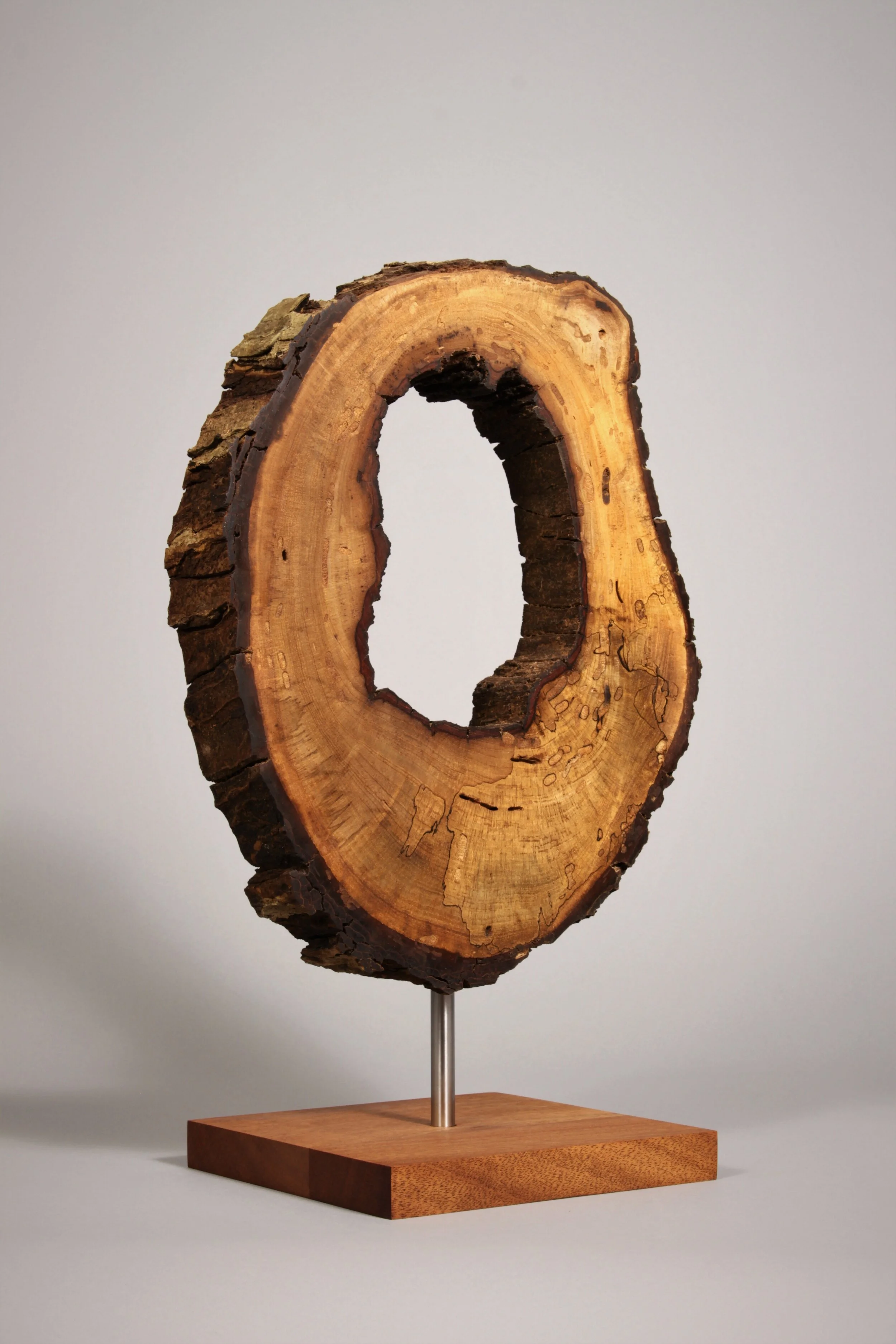 I always enjoy walking along the creek after a rainstorm because there is always something new to be found. New branches litter the ground, and I like to pick through them and collect the ones I find intriguing. One storm blew over a large pecan tree that had died from heart rot. The center of the tree had completely rotted away, leaving a large cavity in the center. The branches were hollow as well, and some had broken off when the tree fell. I took one of these branches back with me and decided to cut a cross-section of it. The log was full of spalting and worm trails, but what caught my attention the most was the center ring. The tree had formed a harder layer around the rot as if to protect itself from further damage.